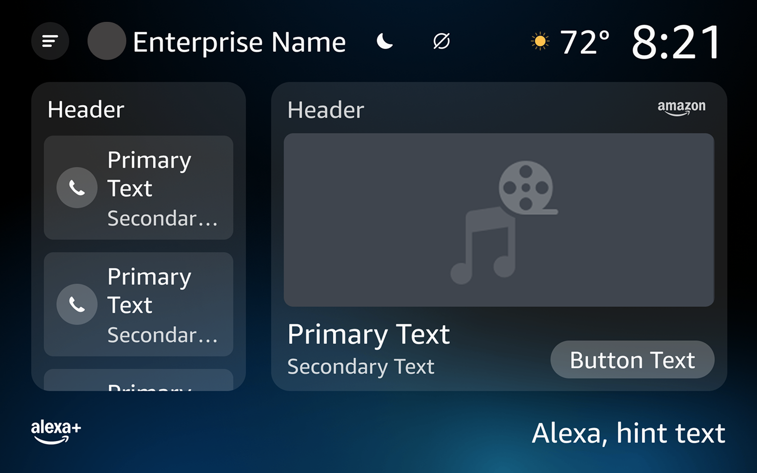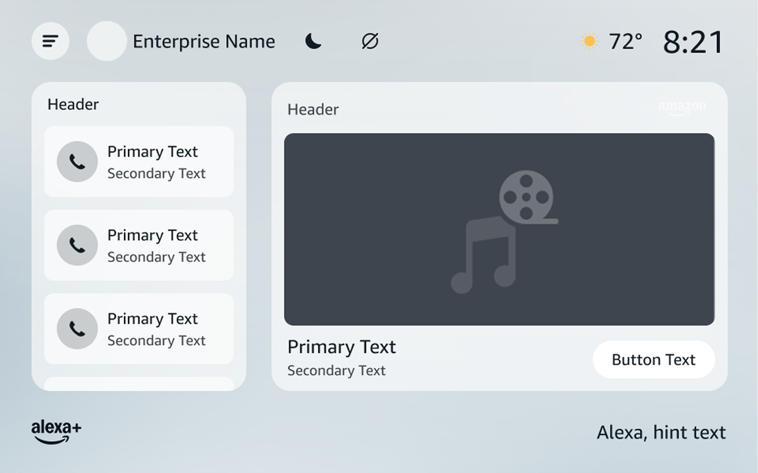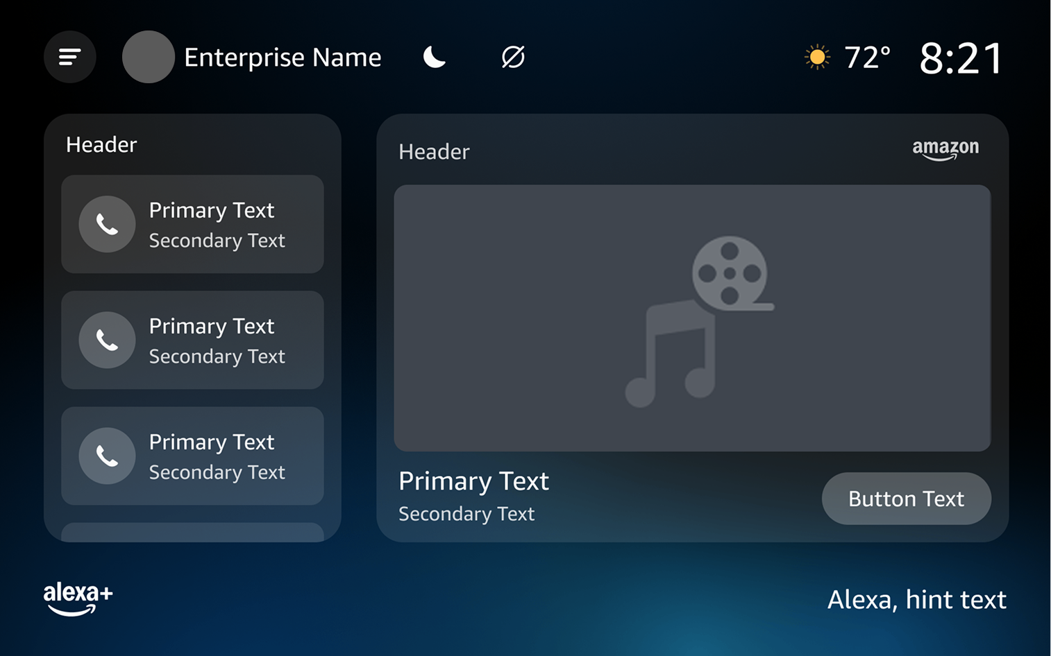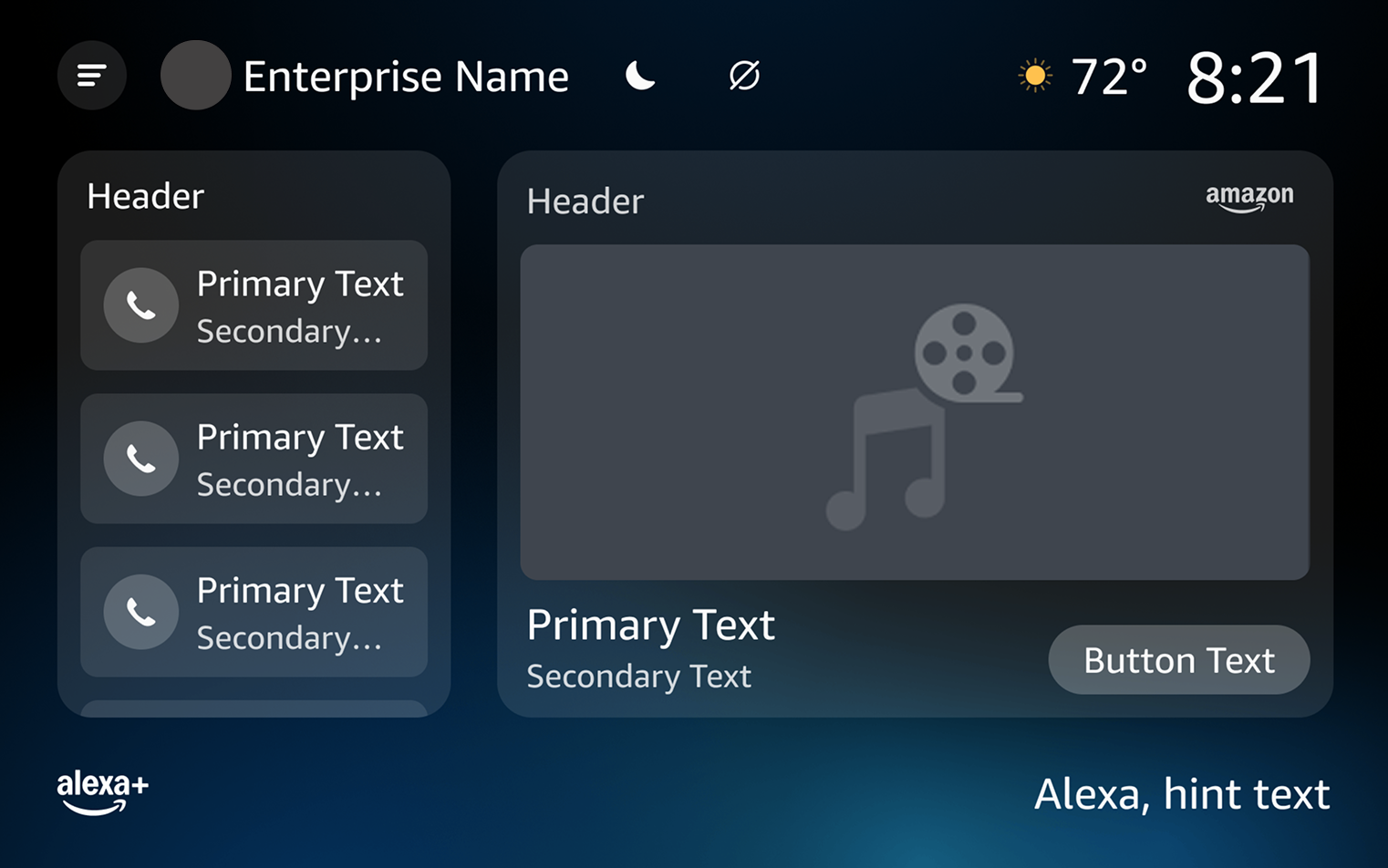 Recreating the layout of the consumer Alexa+ would create continuity between the two experiences, but would require a high level of coordination with the consumer Alexa+ team. The layout is not created with enterprise use cases in mind.