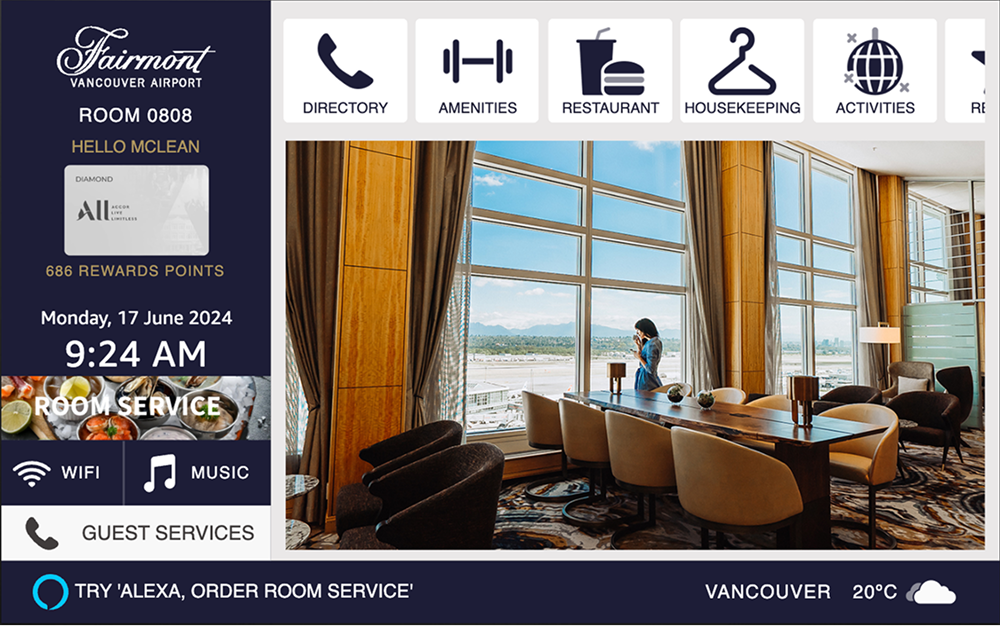 By default, end users see ambient rotating content. They can tap a button to open a menu of property services. This solution supports partners who still want to show ambient content, but limits the discoverability of property features and services.
