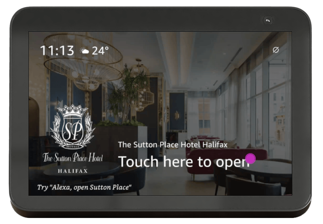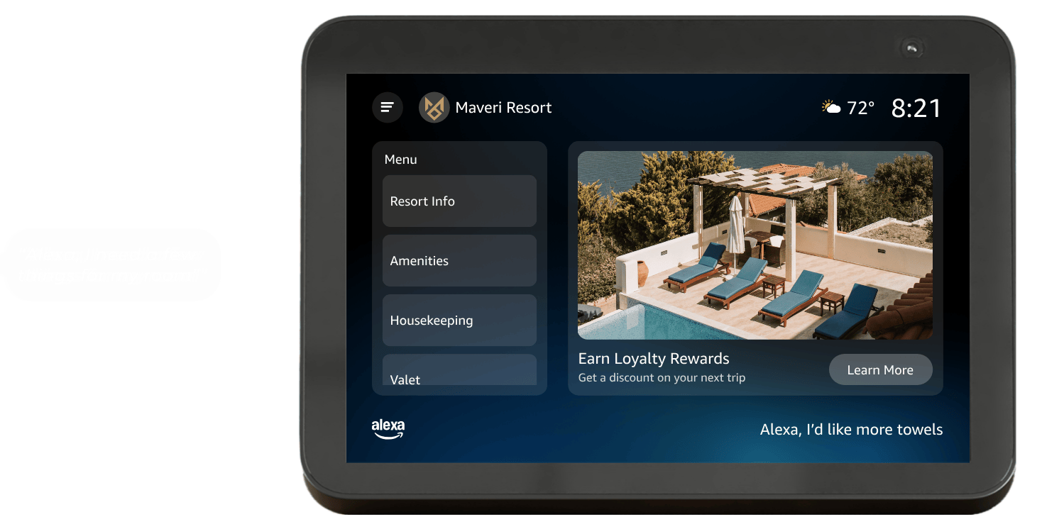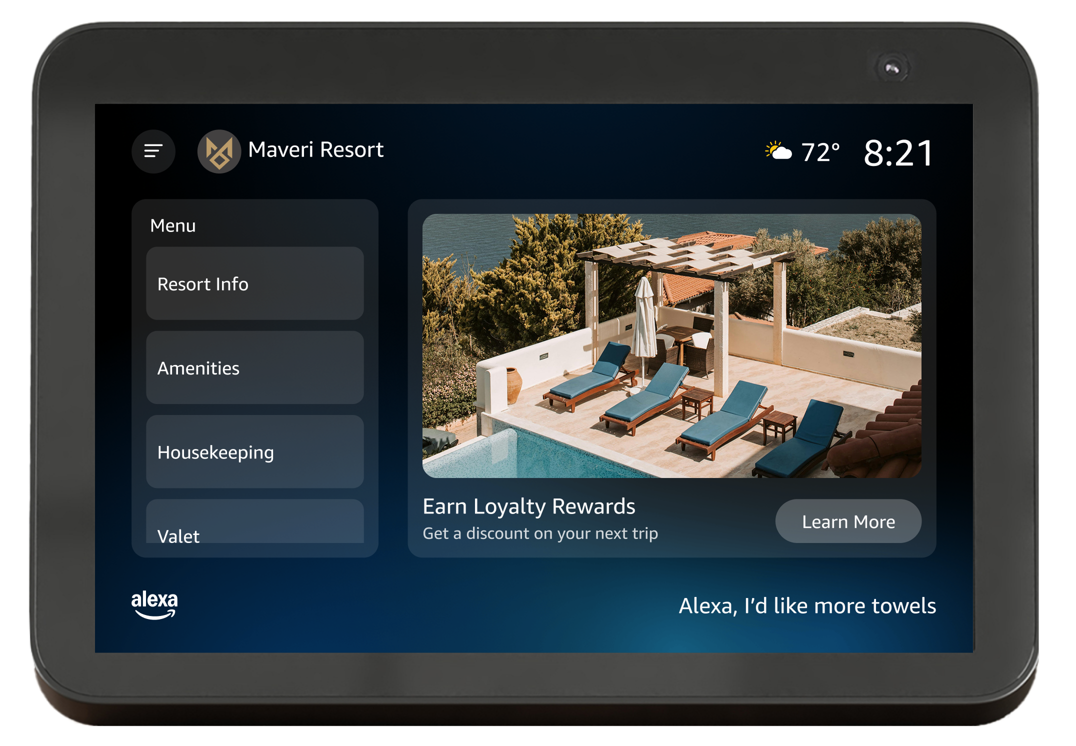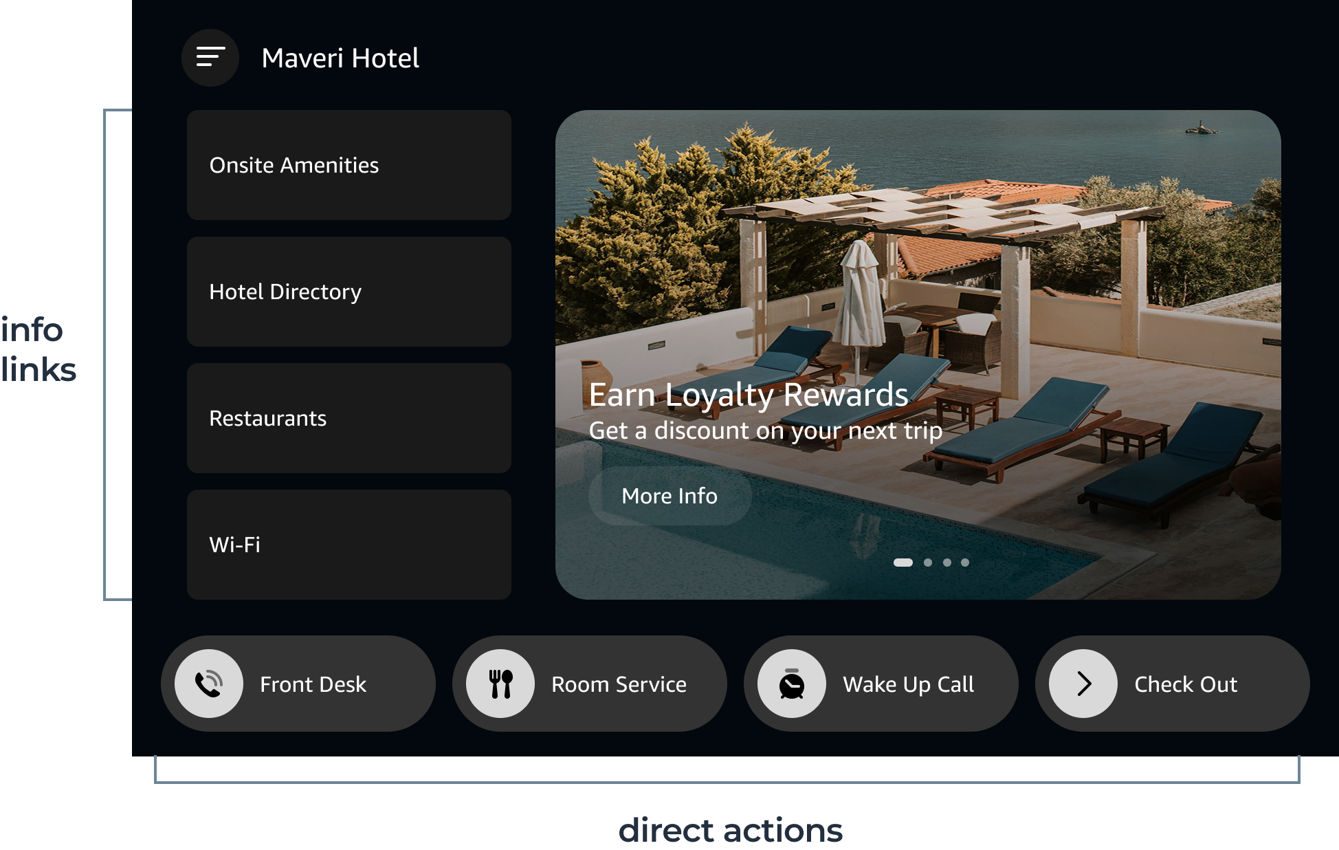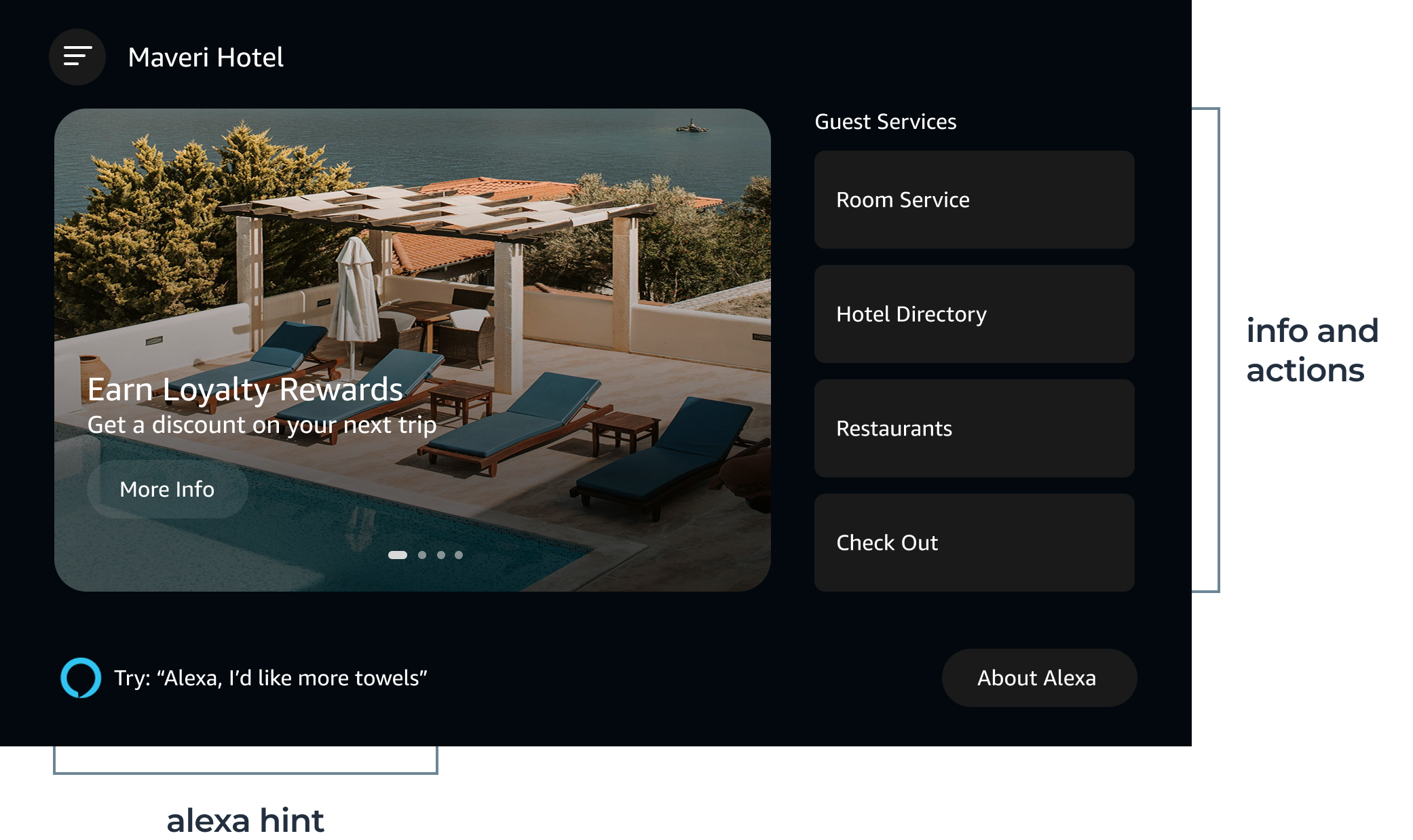 The classic Alexa home screen was not ideal for enterprise properties like hotels, which want to offer persistent access to information and services. Enterprises would solve for this inelegantly with tappable text on a rotating card that opens a menu.