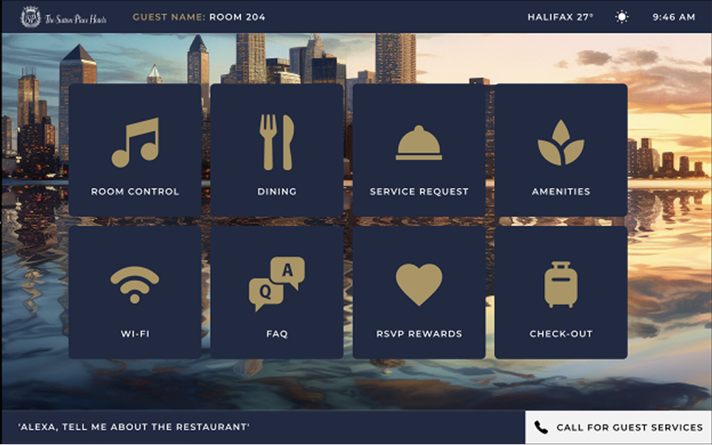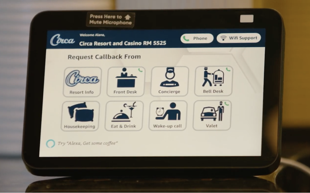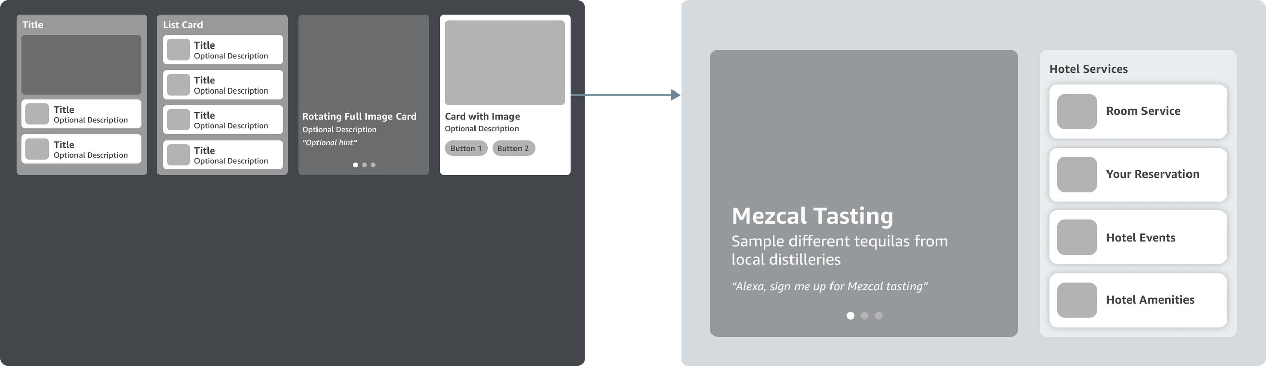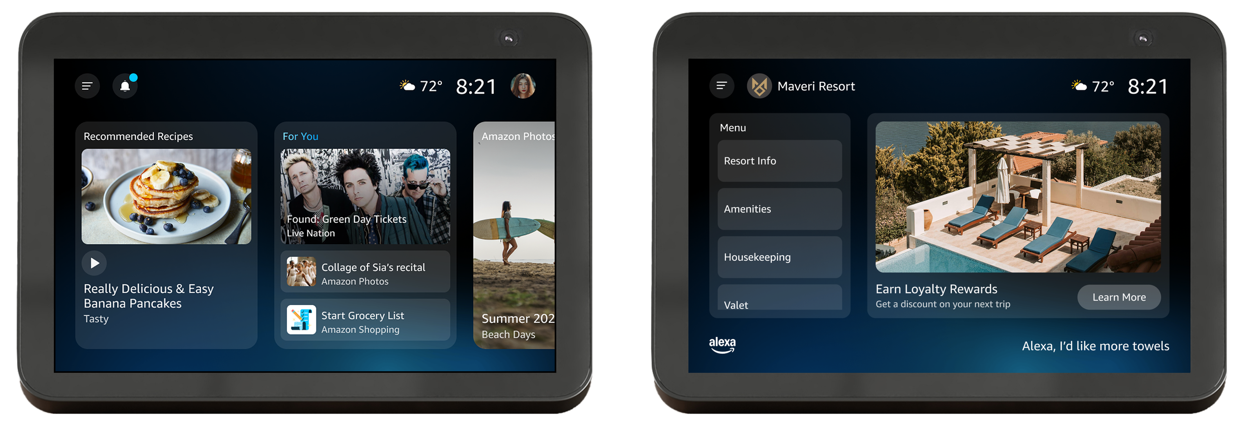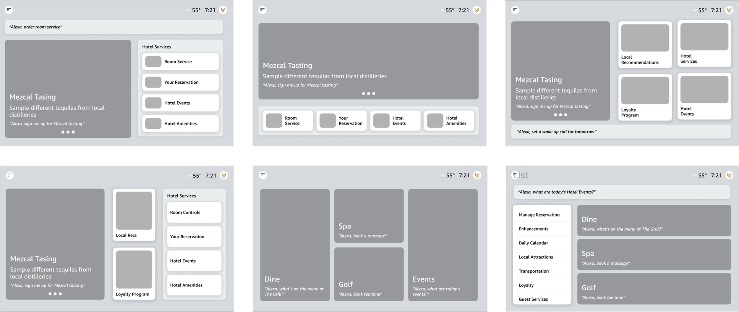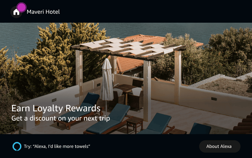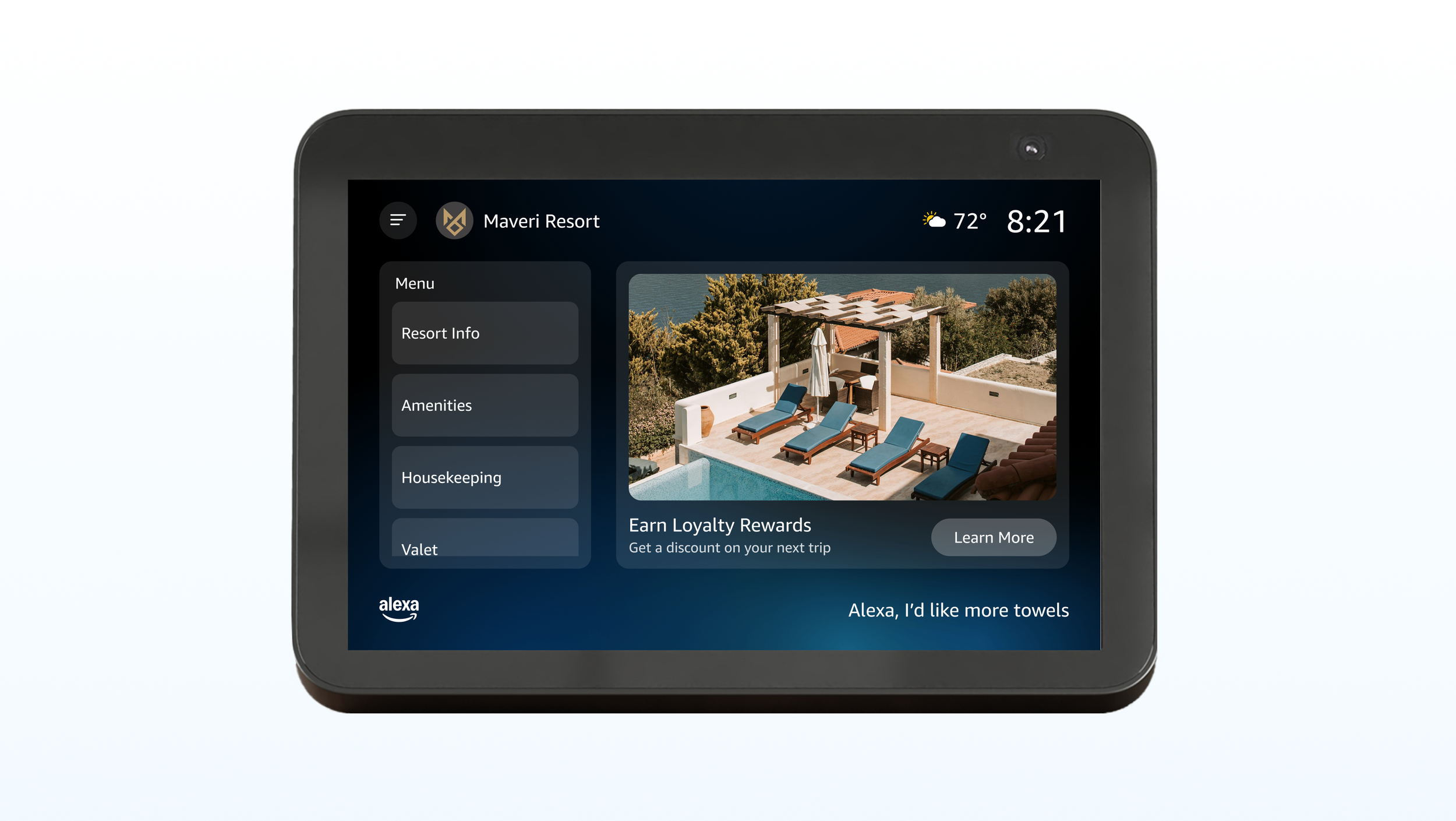 The classic Alexa home screen was not ideal for enterprise properties like hotels, which want to offer persistent access to information and services. Enterprises would solve for this inelegantly with tappable text on a rotating card that opens a menu.
